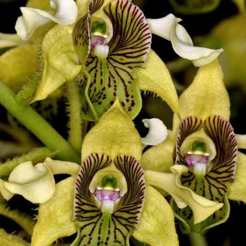 🟢 Vibrant yellow-green blooms with purple-striped lip