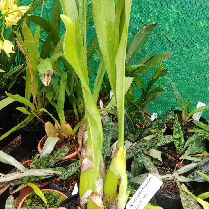 Grammatophyllum scriptum var. citrinum is a majestic orchid known for its large size and pale yellow flowers with contrasting spots. It's a showstopper for orchid collectors who love dramatic displays.