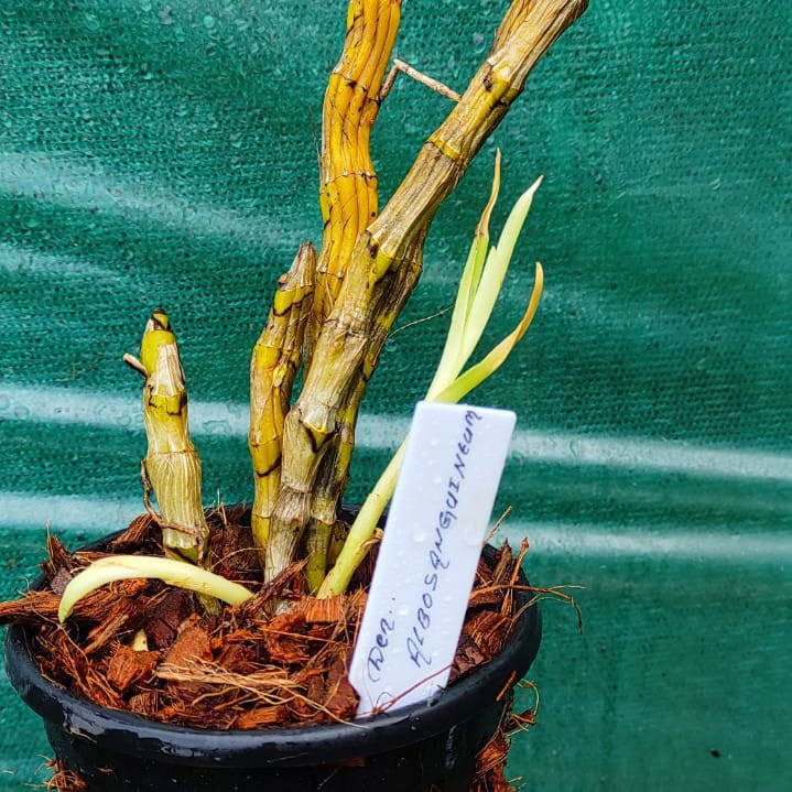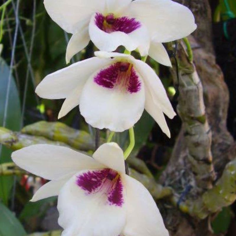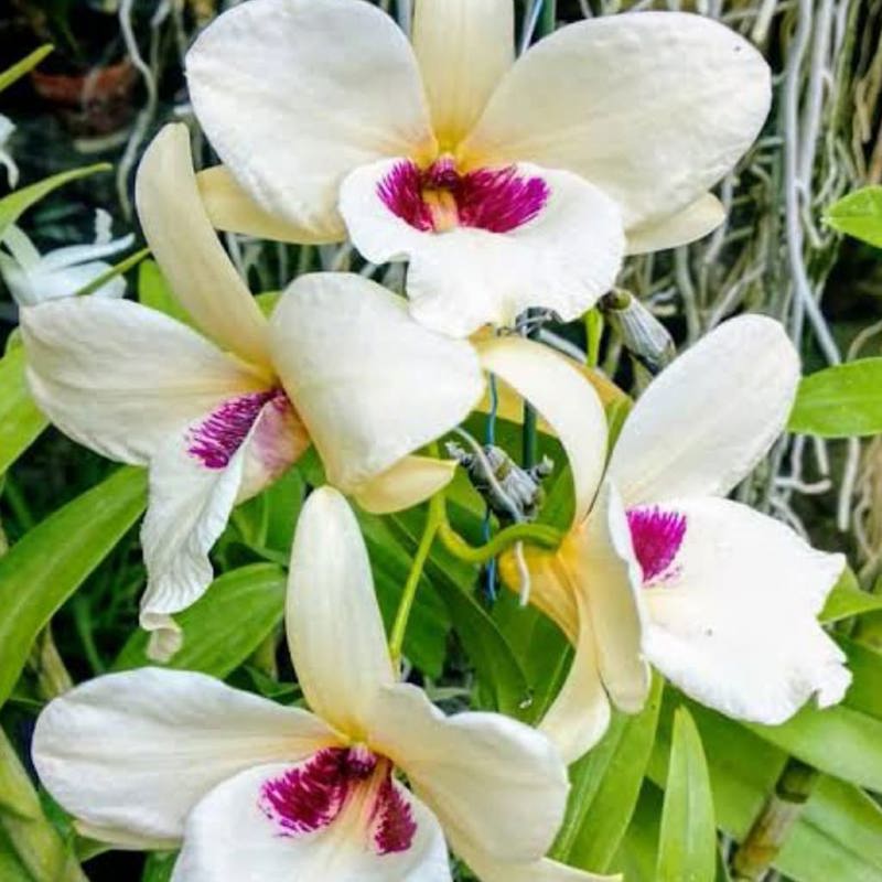 Dendrobium albosanguineum is a striking species native to Southeast Asia, celebrated for its creamy white petals and deep maroon throat. This deciduous orchid adds dramatic flair to any orchid collection.