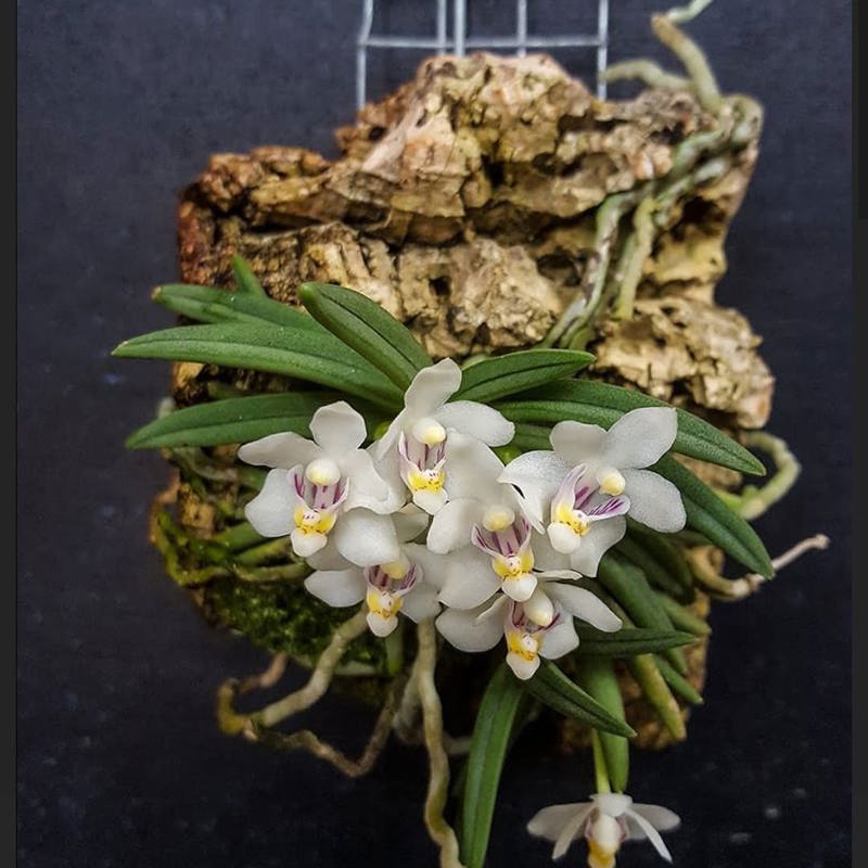 Pteroceras semiteretifolium is a miniature to small-sized epiphytic orchid known for its semi-terete (half cylindrical) leaves and charming white or cream-colored flowers. This rare species prefers intermediate conditions and good humidity.